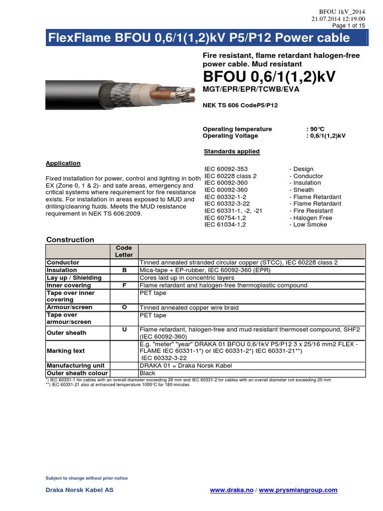 Draka 6491x is a pvc insulated single core low voltage copper wiring cable for installation within enclosed protected environments. Bfou c 250v 2019 draka rev 1 26 06 2019 page 2 of 4 flexflame bfou c 250v s4 s8 s104 instr. Offshore cables bfou rfou. T d distribute offshore cables to provide lv mv hv power control instrumentation and signalling for use in the oil and gas marine and shipping industries which are compliant with nek 606 series standards.